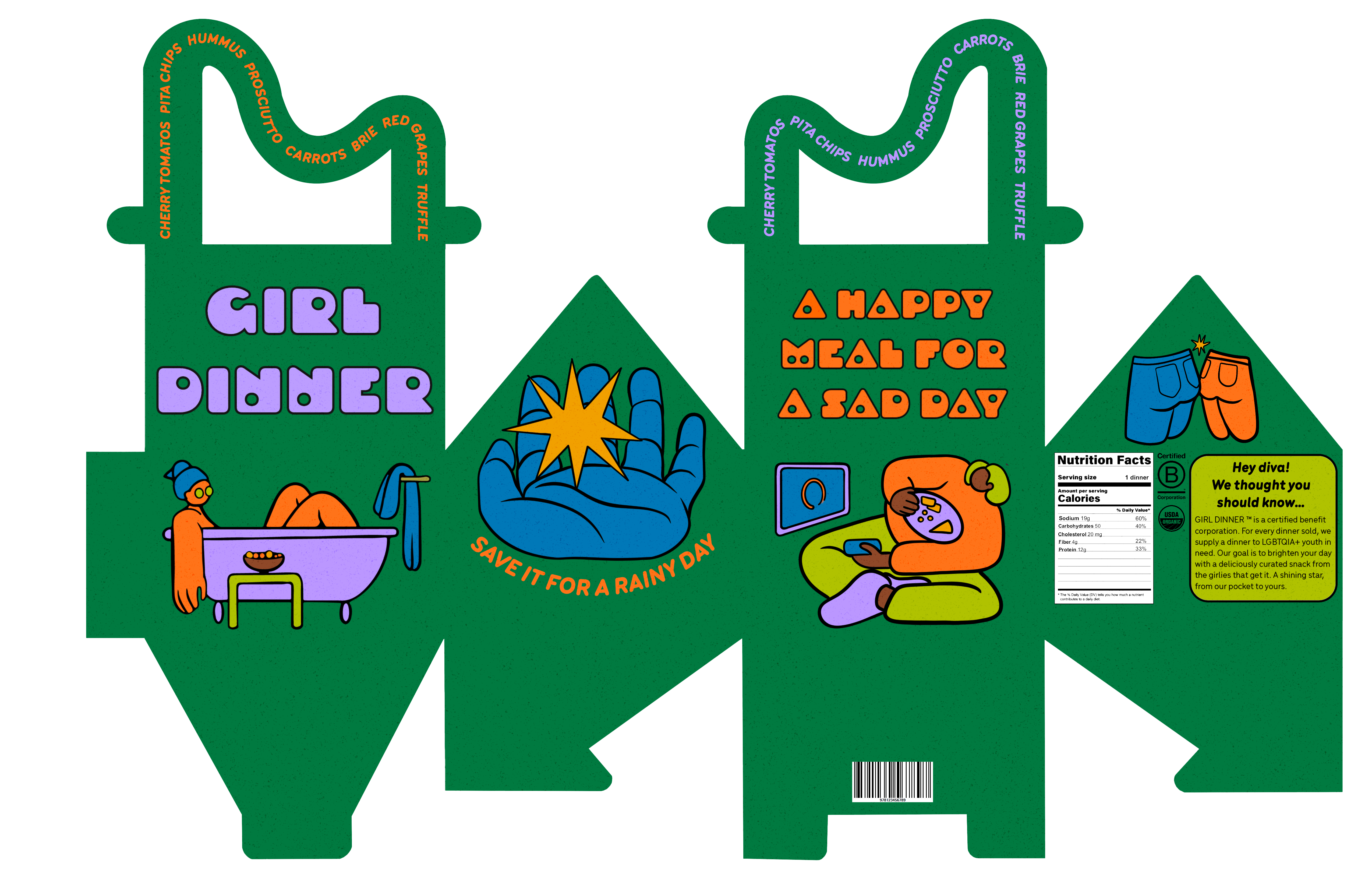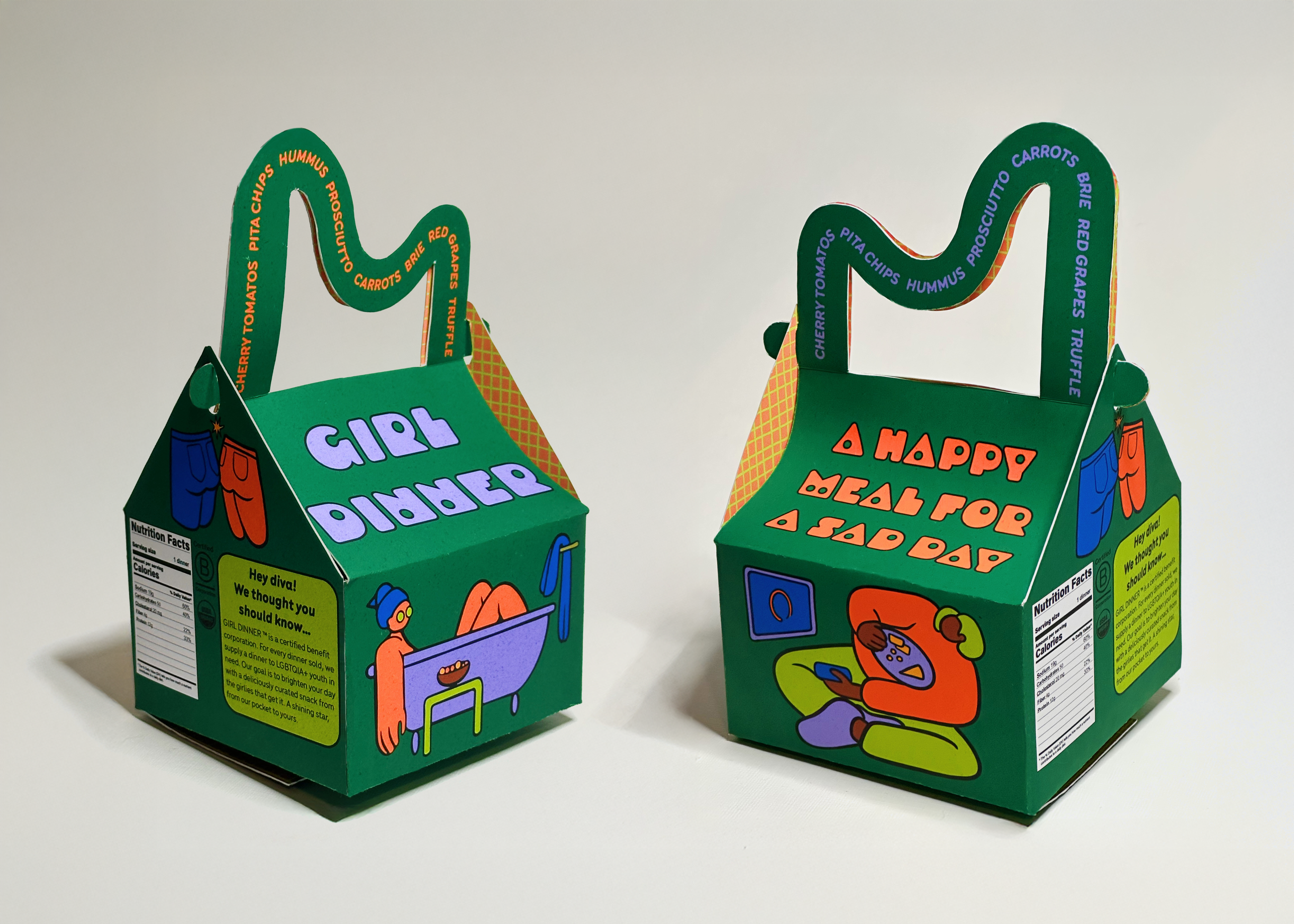Originally an internet meme sensation, Girl Dinner is a concept that frames “lazy” meals as a means of caring for your inner child, or just doing your best. Born from the desire to do less, and chill more, this snack box is filled with snacks like cherry tomatoes, prosciutto, and carrots.